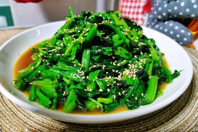 【材料】:菠菜1把,熟芝麻适量,干红辣椒2个,生抽1勺,油适量